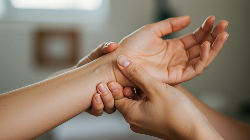 긴장된 손과 손목 근육을 부드럽게 풀어주면 혈액 순환이 원활해지고 저림 증상을 완화하는 데 도움이 됩니다.